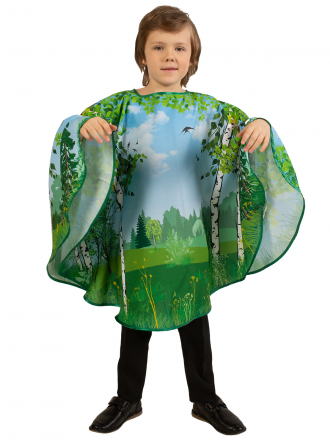 Карнавальный костюм «Березка» – легкая модель свободного кроя, регулируемая сзади на завязках. На изделие нанесен рисунок березовой рощи, выполненный по оригинальным эскизам наших художников. В данном костюме низ не предусмотрен, поэтому можно сочетать накидку с любой юбкой, джинсами или шортами. Крой не стесняет движения: накидка подойдет даже для активных игр. Накидка имеет зеленый кант.